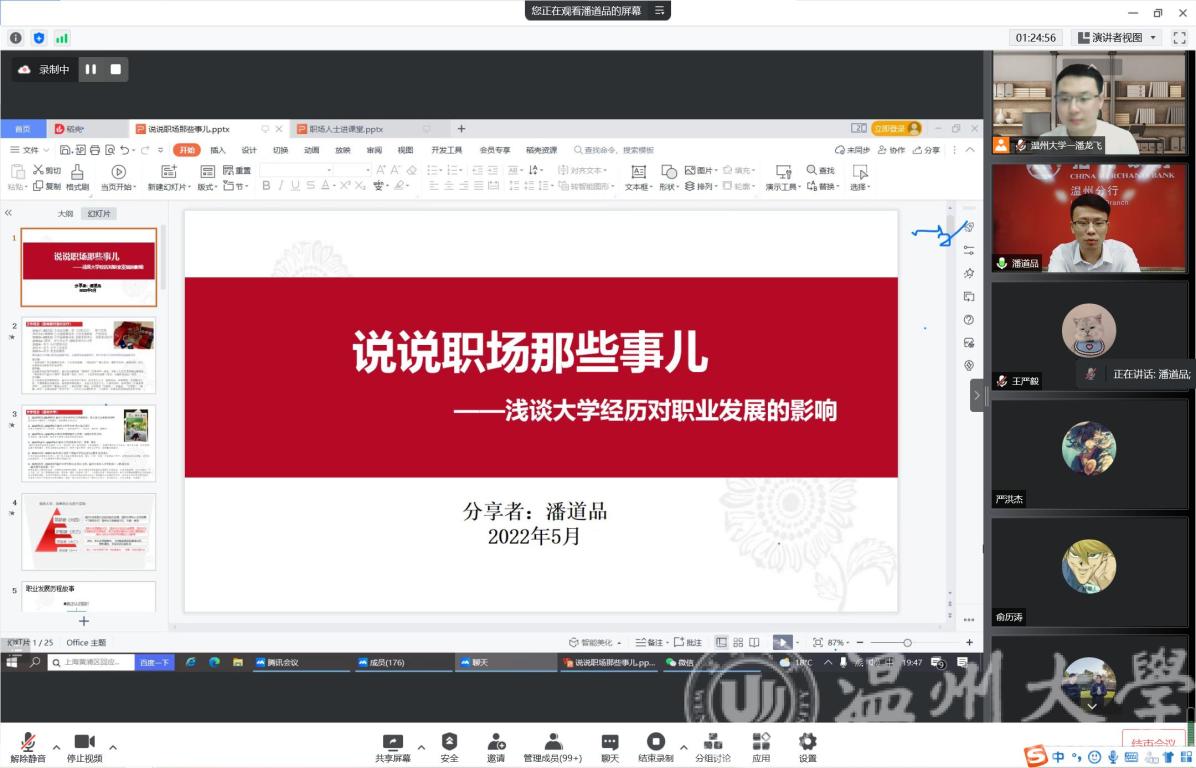 会议伊始,潘老师简单介绍了潘道品校友的基本经历和现任职务。紧接着潘道品校友以《说说职场那些事儿——浅谈大学经历对职业发展的影响》为题,正式进行讲座。潘道品校友首先讲述了他大学学习和生活的经历,主要总结为大一的初试者、大二的开拓者、大三的护航者、大四的筑梦者四个阶段。紧接着,他分享了毕业之后的职业发展历程。初入职场时,他是一名信心满满的招商银行温州分行的客户经理,在工作了一段时间后,遇到了挫折,转型成为一名产品经理,从而真正认识到了自己与职业的关系。在积累了一定的工作经验后,他找到了适合自己的职业发展道路,并且全身心投入到分行办公室的工作中去,也成为了战略宣导中心主管,实现了自我的突破。