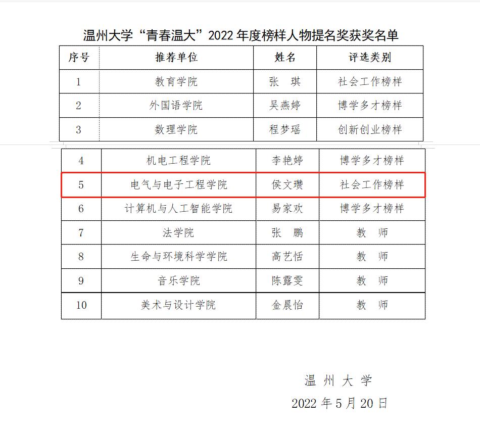 近期,温州大学“青春温大”2022年度榜样人物提名奖获奖名单公布,球探体育比分网 19级侯文瓒同学荣获温州大学“青春温大”2022年度榜样人物提名奖。
