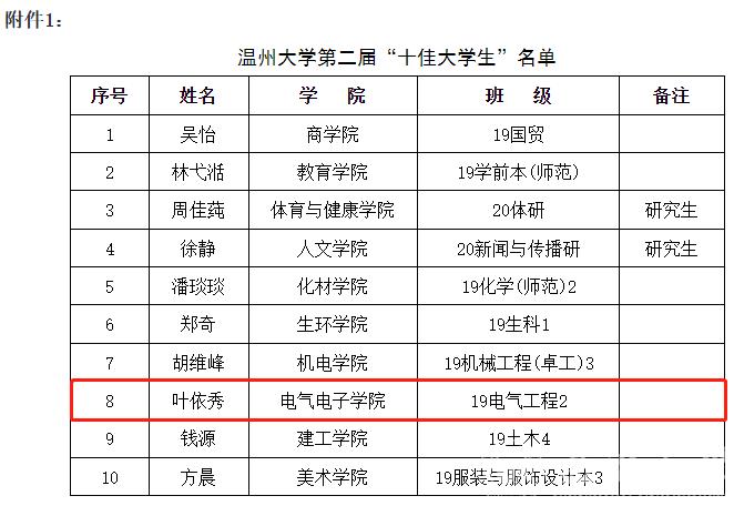 近期,温州大学第二届“十佳大学生”获奖名单公布,球探体育比分网 19级叶依秀同学荣获温州大学第二届“十佳大学生”荣誉称号。