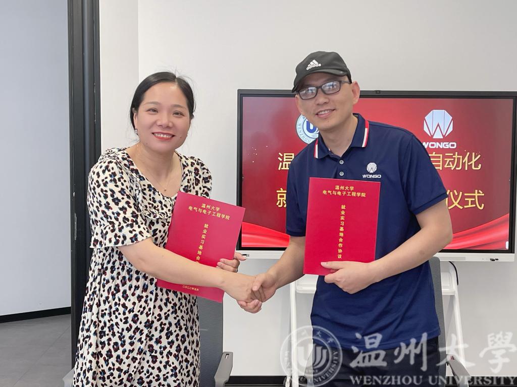 随后,温州大学代表曾蓓蕾与公司方代表汤豪签订就业实习基地协议,李方强为就业实习基地授牌。