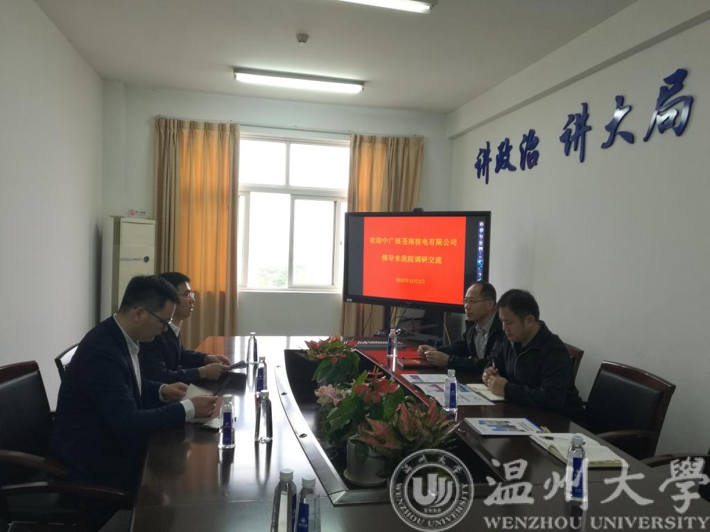 2022年11月2日上午10:10,中国500强、知名央企——中广核苍南核电有限公司技术部副经理刘二林、信息文档经理孙方兴与核燃料主管工程师刘洋在1A512会议室与球探体育比分网 党委副书记曾蓓蕾、学工办主任廖晓安、就业辅导员屠昌浩以及研究生辅导员余明新就关于2023届毕业生招聘以及建立长期就业实践基地进行了充分的交流。