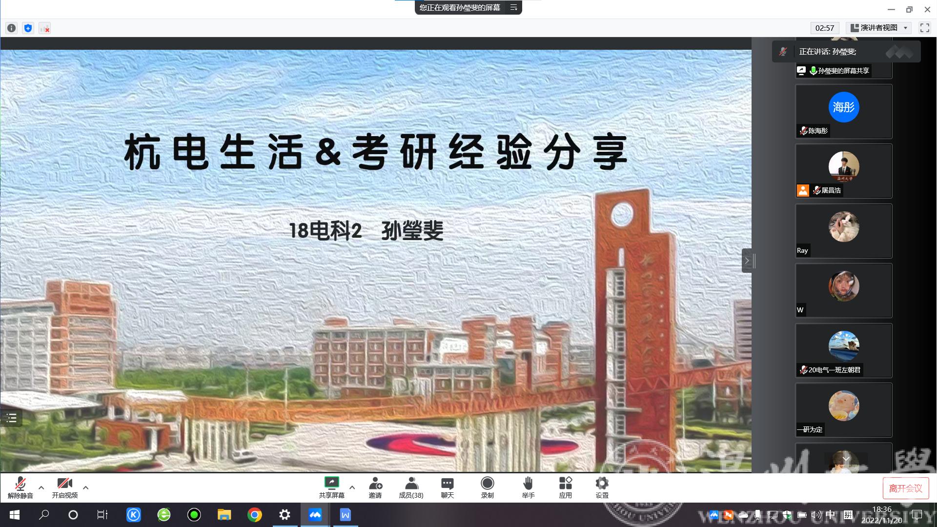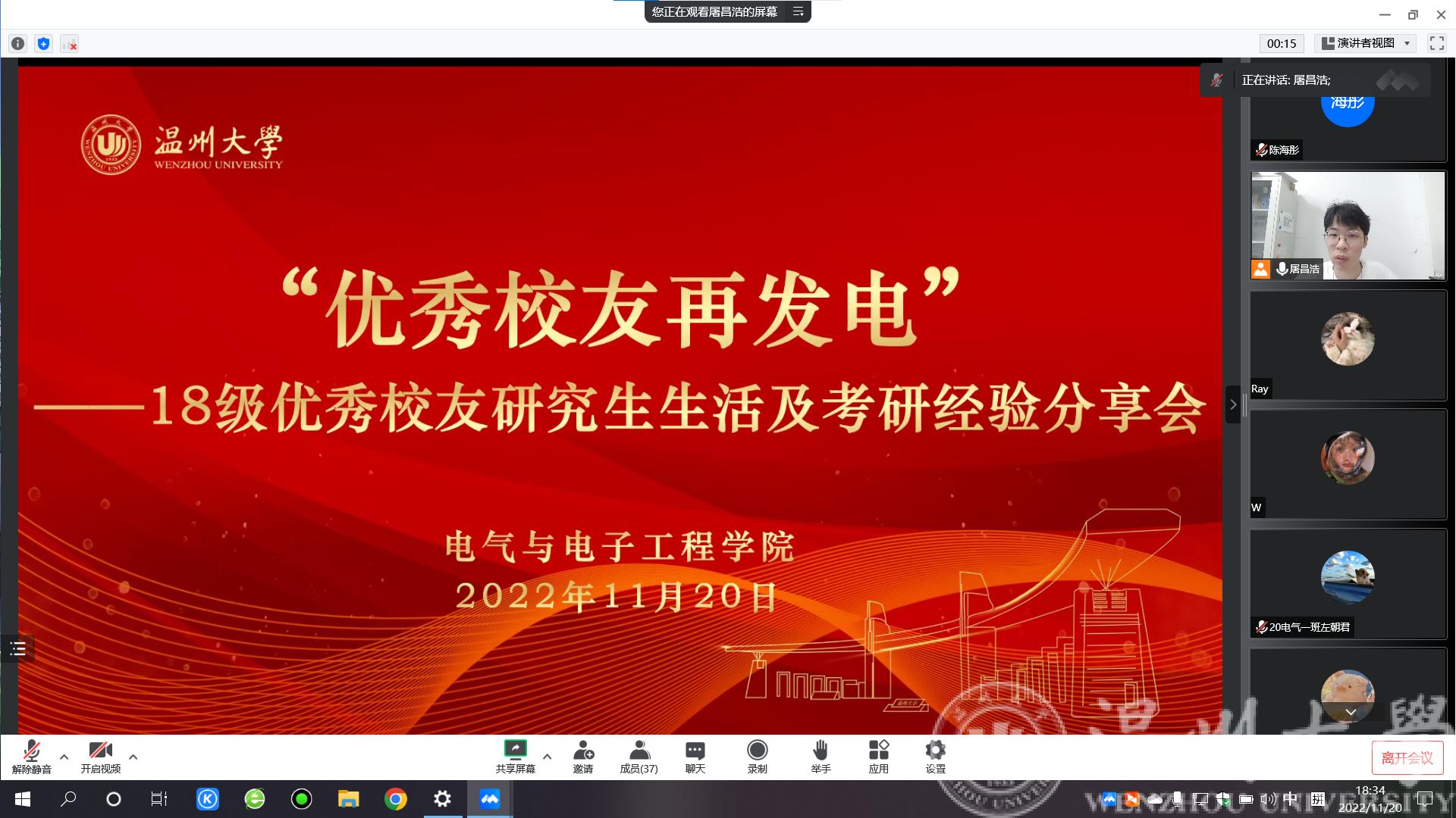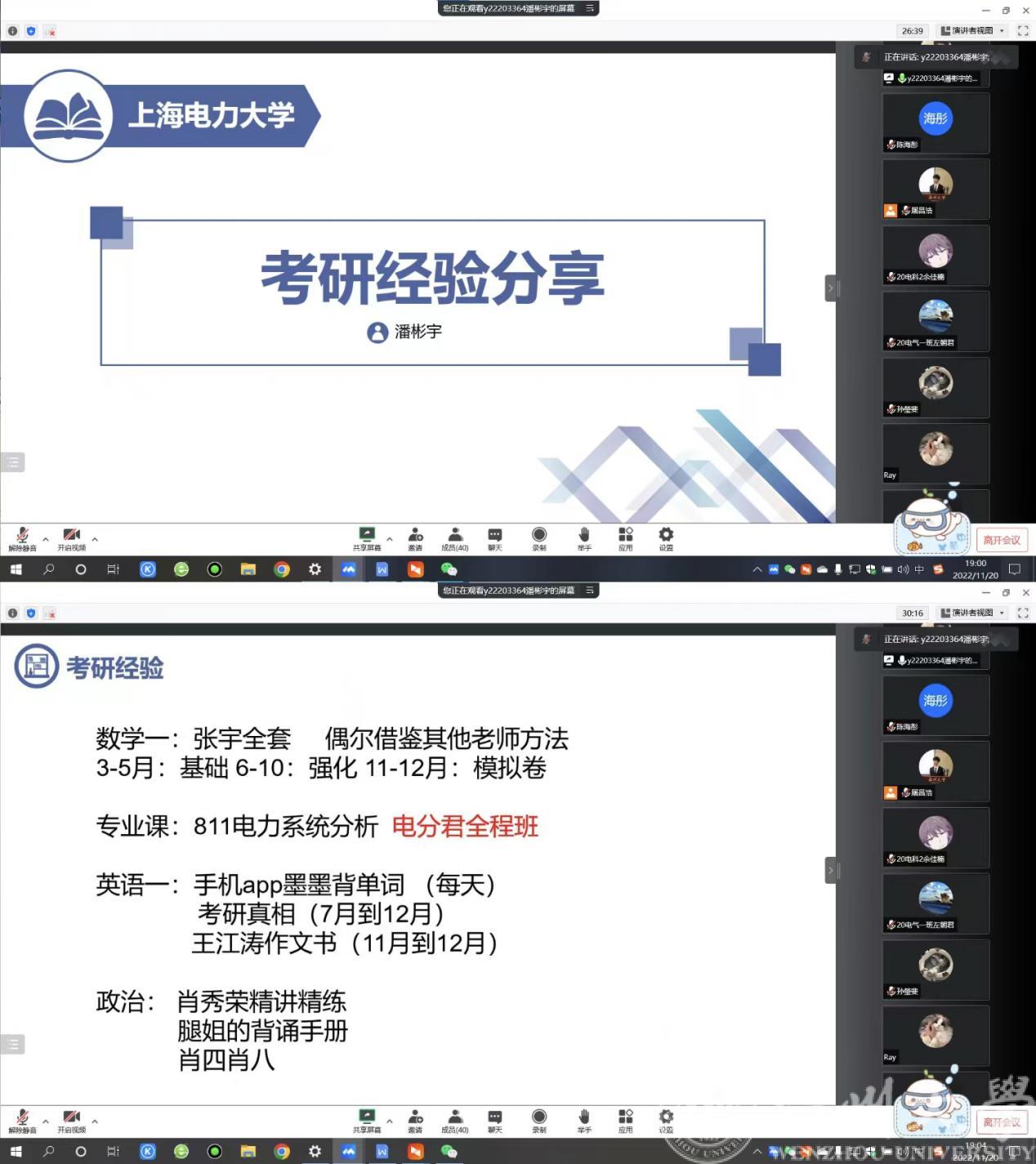 为进一步营造提高球探体育比分网 学生考研热情,营造良好考研氛围,同时增强校友与母校交流合作,发挥校友榜样力量。球探足球 于11月20日晚召开组织召开线上18级优秀校友考研经验分享会。本次分享会邀请到2022届优秀毕业生孙瑩斐(目前就读于杭州电子科技大学,电子科学与技术专业)、潘彬宇(目前就读于上海电力大学,电气工程专业)为学弟学妹们们分享考研经验和研究生生活。出席本次会议的有院负责校友工作的辅导员屠昌浩老师、负责考研工作的辅导员陈海彤老师,即将参加2023年考研的学生及其他年级有意向考研同学。