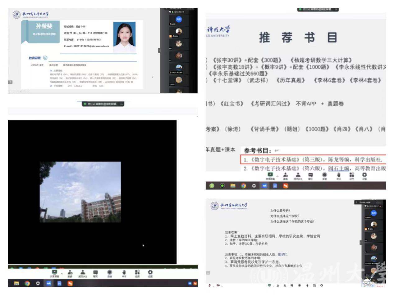 首先由2022届校友电科专业孙瑩斐分享她的考研经验。孙瑩斐和学弟学妹们分享了自己的研究生生活,随后对杭电目前招考、备考科目以及往年录取情况进行介绍。并在院校选择、书目推荐、专业课学习方法等方面都提出很多好的建议。孙瑩斐指出要坚定自己考研的想法,清晰自己考研的目的和方向,不要受其他外界因素干扰。