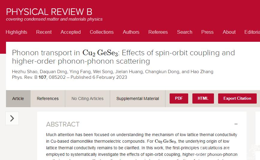 近日,民进温州市委会委员、民进温州大学基层委副主委、温州大学副研究员邵和助团队在国际期刊《Phys. Rev. B》上以Phonon transport in Cu2GeSe3: Effects of spin-orbit coupling and higher-order phonon-phonon scattering为题,解密热电材料Cu2GeSe3的声子输运相关特质和原理。