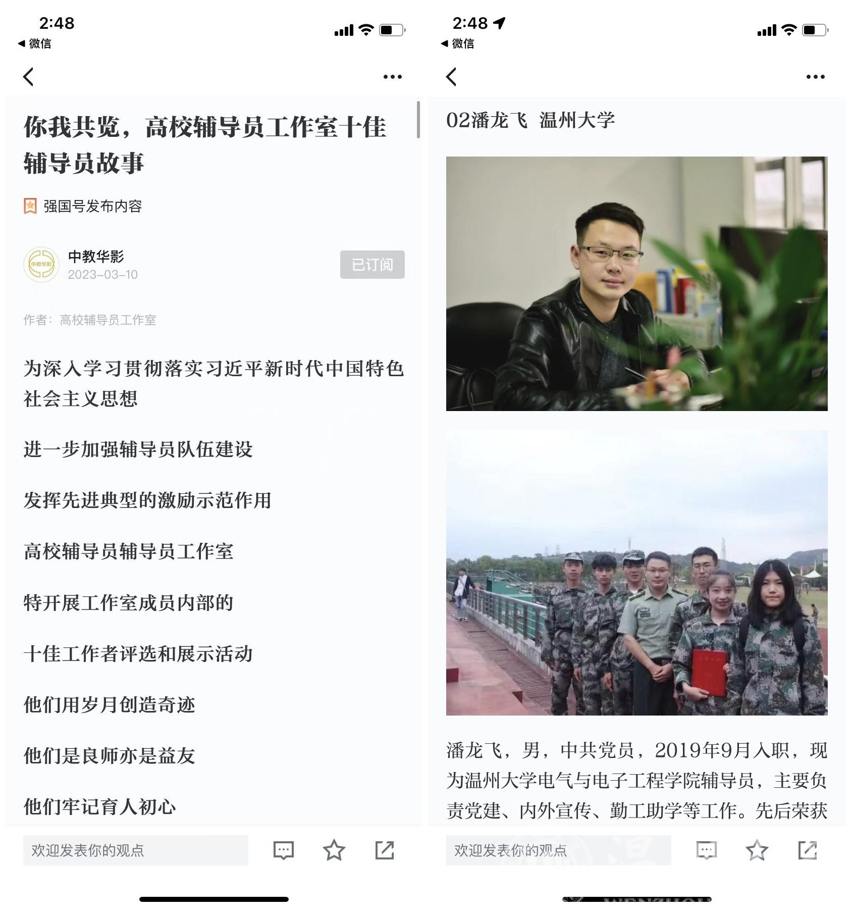 3月10日,学习强国刊发了一篇名为《你我共览,高校辅导员工作室十佳辅导员故事》的文章,该篇文章系全国高校辅导员工作室,为深入学习贯彻落实习近平新时代中国特色社会主义思想,进一步加强辅导员队伍建设,发挥先进典型的激励示范作用,进行的十佳工作者评选和展示活动,球探体育比分网 辅导员潘龙飞也在其中。