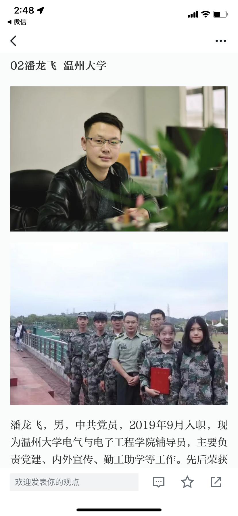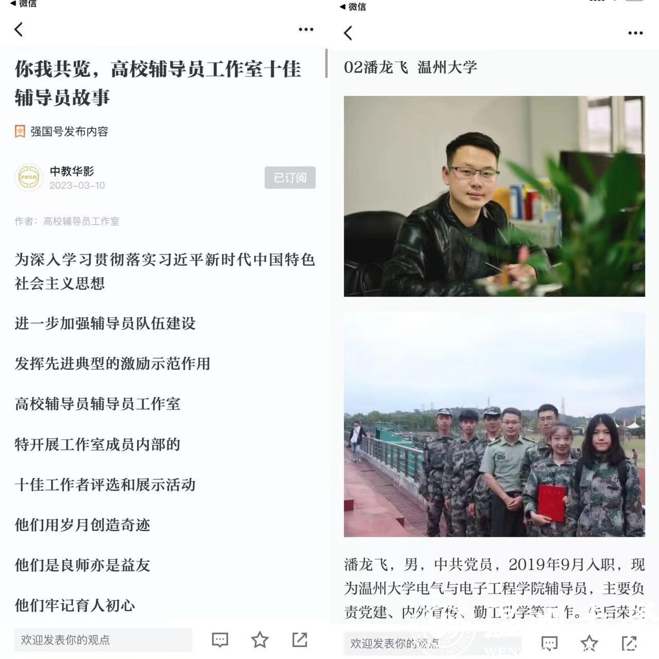3月10日,学习强国刊发了一篇名为《你我共览,高校辅导员工作室十佳辅导员故事》的文章,该篇文章系全国高校辅导员辅导员工作室,为深入学习贯彻落实习近平新时代中国特色社会主义思想,进一步加强辅导员队伍建设,发挥先进典型的激励示范作用,进行的十佳工作者评选和展示活动,球探体育比分网 辅导员潘龙飞也在其中。