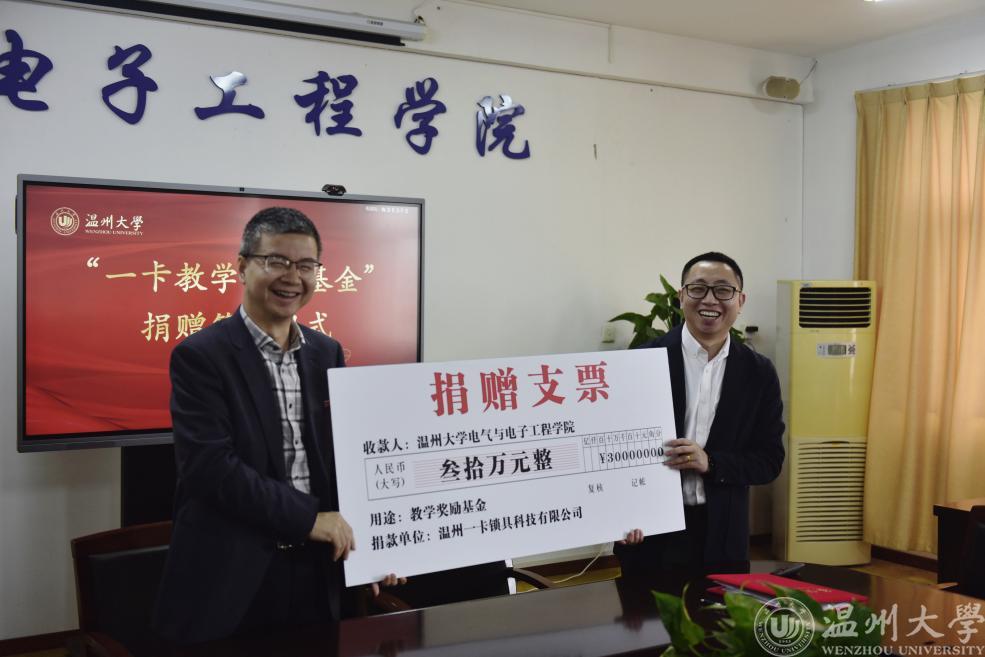4月12日,温州大学与温州一卡锁具科技有限公司签订合作协议,同时企业向学校捐赠设立“一卡教学奖励基金”。根据协议,温州一卡锁具科技有限公司向学校无偿捐资30万元人民币,在该校球探体育比分网 设立“一卡教学奖励基金”。