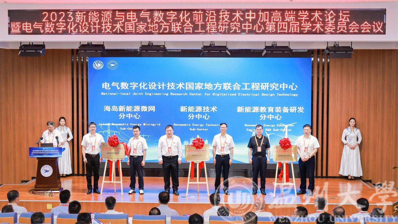 会议上宣布了电气数字化设计技术国家地方联合工程研究中心第四届学术委员会名单,还为电气数字化设计技术国家地方联合工程研究中心和落户在安防球探足球 的新能源技术分中心、落户在国网平阳中心的海岛新能源微网分中心、落户在亚龙智能装备集团股份有限公司的新能源教育装备研发分中心等三个分中心揭牌。当天,由安防球探足球 、温州大学联合新能源龙头企业创设的新能源行业产教融合共同体举行了启动仪式。