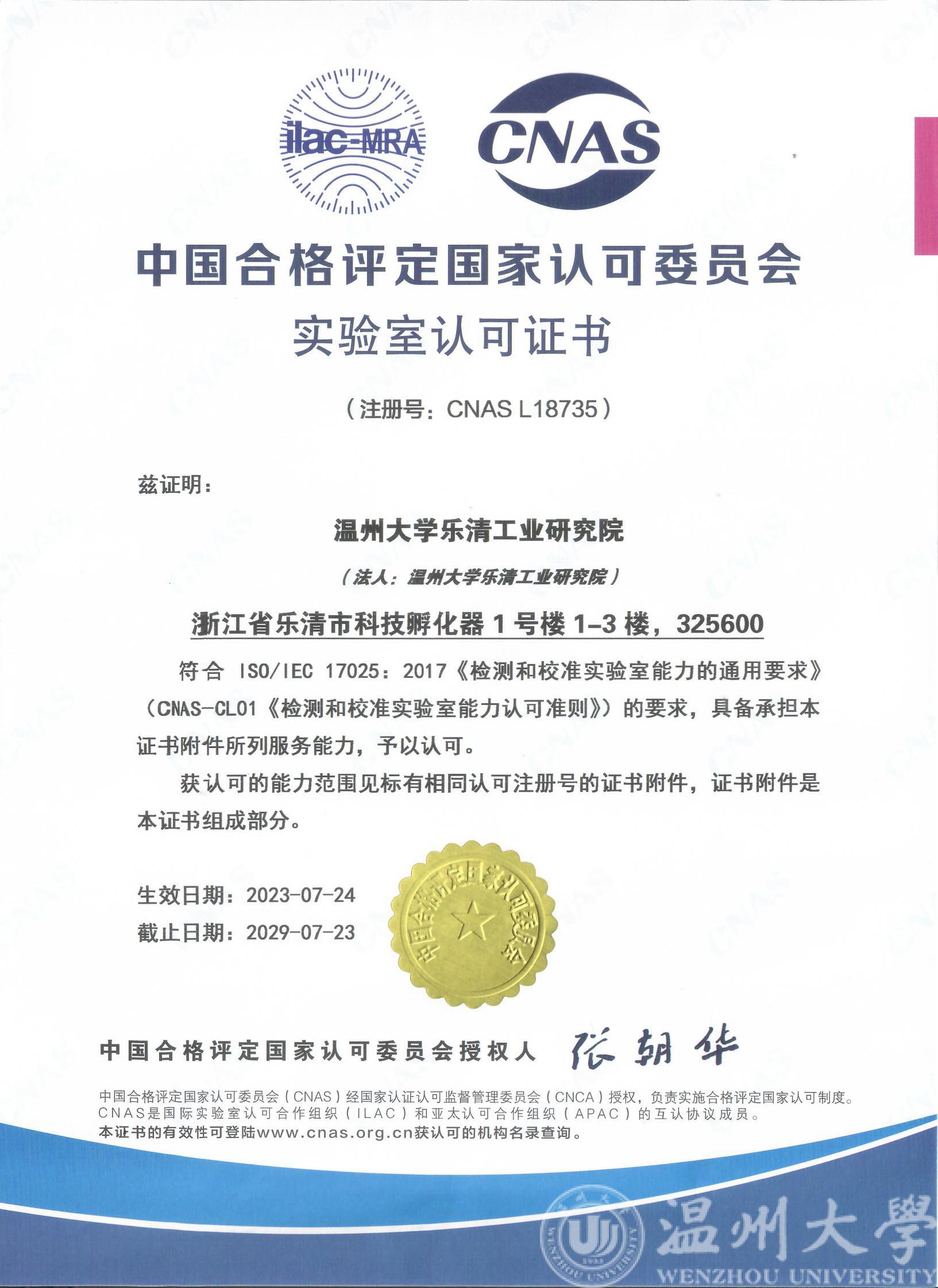 2023年7月,温州大学乐清工业研究院喜获CNAS、CMA证书,助力电气产业产品研发测试创新能力提升!