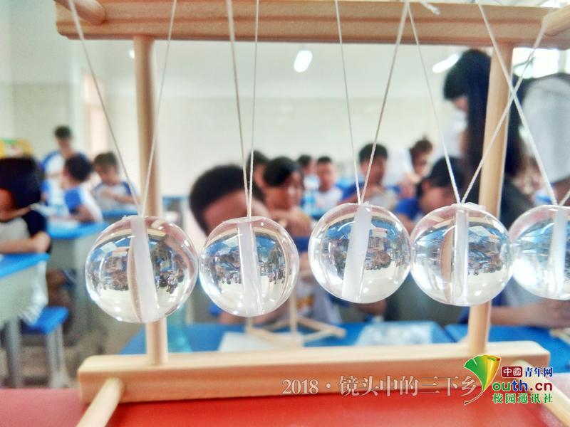 早上,队员们为学员们介绍牛顿摆,首先他们仔细讲解了牛顿摆的原理,紧接着在学员们期盼的眼神中,分发给他们材料,逐步进行组装,期间学员们遇到问题也会请教队员们,队员们也不遗余力的给予帮助。很快,牛顿摆就成型了,随着珠子的摆动孩子们露出来开心的笑脸。中国青年网通讯员 杨婧雯 摄