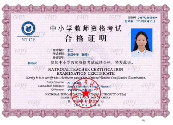 22岁的湖州女孩陈亦安,是温州大学数理与电子信息工程球探足球 物理师范专业的应届毕业生。2017上半年至今,她先后考取了三个教师资格证:物理教师资格证、数学教师资格证和通用技术教师资格证。一人持有三个教师资格证,在温州大学师范类学生中极为少见,因此她的老师和同学笑说:“陈亦安同学考证跟玩儿似的。”