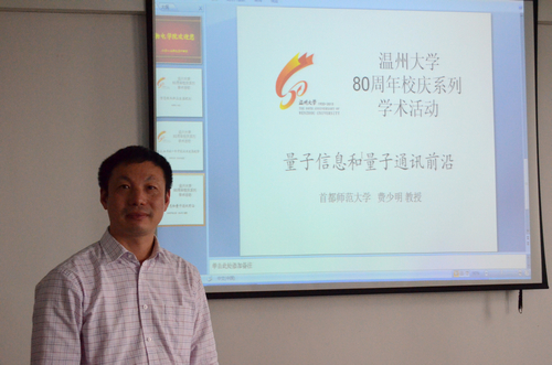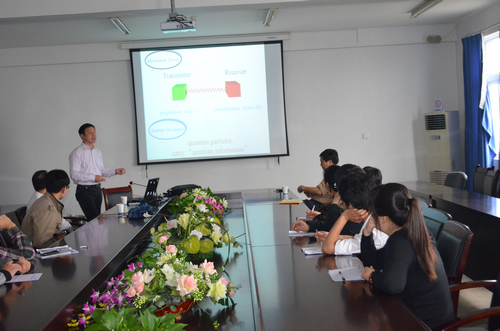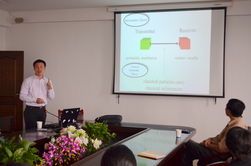 4月18日,首都师范大学费少明教授来球探体育比分网 学术交流,并做了《量子信息和量子计算前沿》的学术报告。费教授介绍了他们提出的关于量子态纠缠度刻画方面的一系列工作,并与球探体育比分网 相关老师和研究生做了深入的探讨。 费少明教授的研究方向主要为量子物理以及相关的数学物理问题,在Phys.Rev.Lett.等杂志发表SCI论文130余篇,在国内外作邀请报告80余次,担任美国数学学会“数学评论”杂志评论员、中德文化教育交流协会理事、意大利科研评估理事会(CIVR)专家组成员,《Advances in Mathematical Physics》和《中国科学: 物理学 力学 天文学》等国际杂志编委。