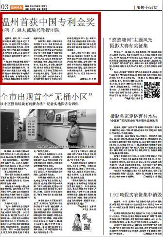 公开资料显示,本届中国专利奖共有 2479 个项目参评,经过激烈竞争和层层评审,国家知识产权局和世界知识产权组织决定授予其中的30个项目中国专利金奖,其中高校获奖项目仅为 7 项。“温大历来重视知识产权的创造、管理、营运和保护,近年来,更是在人才评价、岗位聘用、绩效考核等方面不断制定、完善政策,有力推动了学校知识产权的高效营运。”温州大学相关负责人介绍,该校在今年4月发布的中国高校专利转让排行榜中位列全国第 74 位,在浙江省重点建设高校中排名第5位,展示了温大在助推区域社会经济发展中高质量的知识产权工作成效。