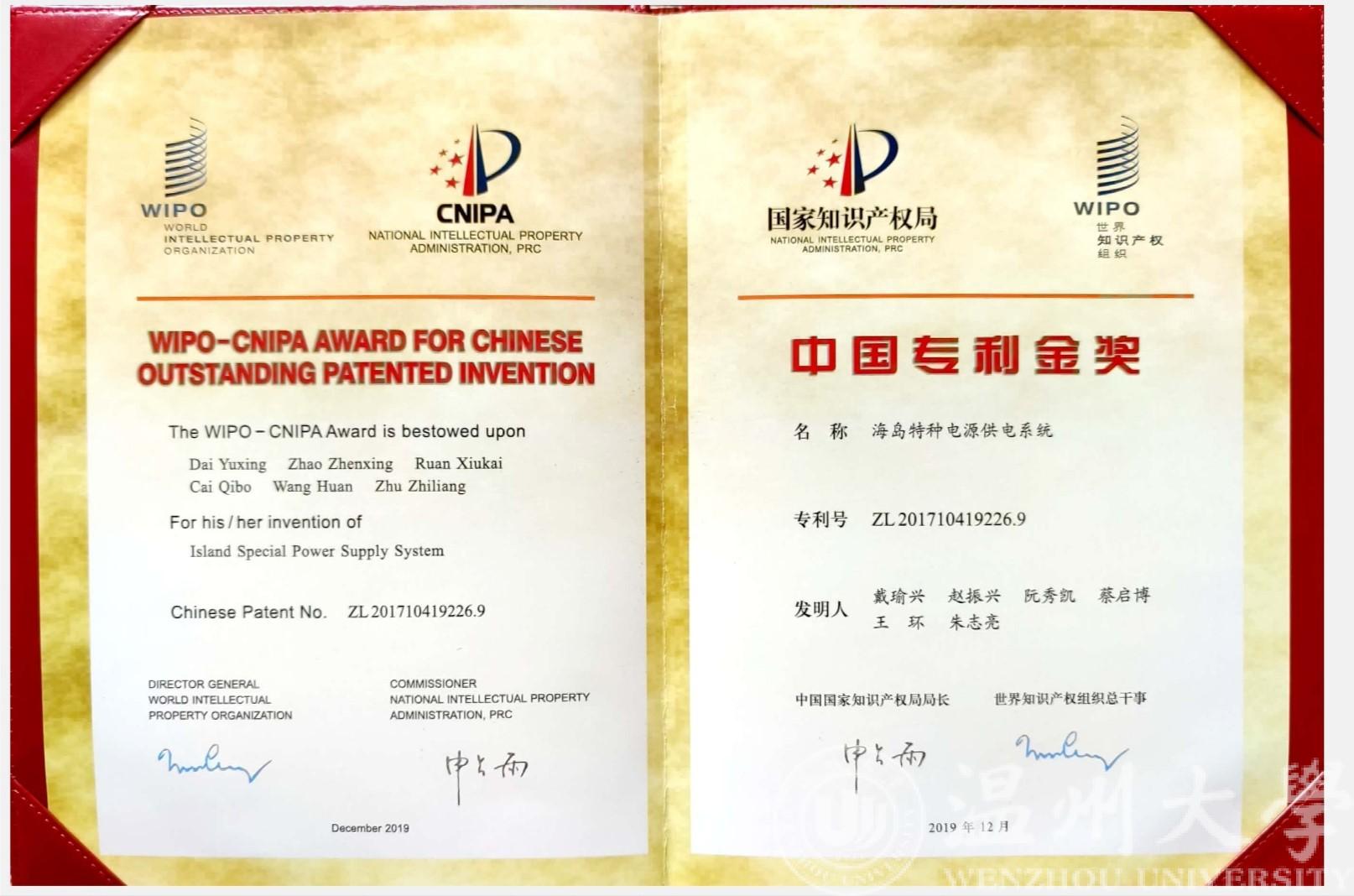 以温州大学为专利权人、戴瑜兴教授为第一发明人的发明专利“海岛特种电源供电系统”凭借其国际领先的技术水平、显著的经济与社会效益,获第二十一届中国专利金奖。该奖项是温州大学首次获得中国专利金奖,也是温州市首次获得该项殊荣。“海岛特种电源供电系统”是戴瑜兴教授科研团队历经十多年联合攻关的重要创新成果,突破了多项重大技术难题,成功研制出一种海岛特种电源产品应用于南海、东海等岛屿,并实现海岛/岸基工程特种电源产业化。