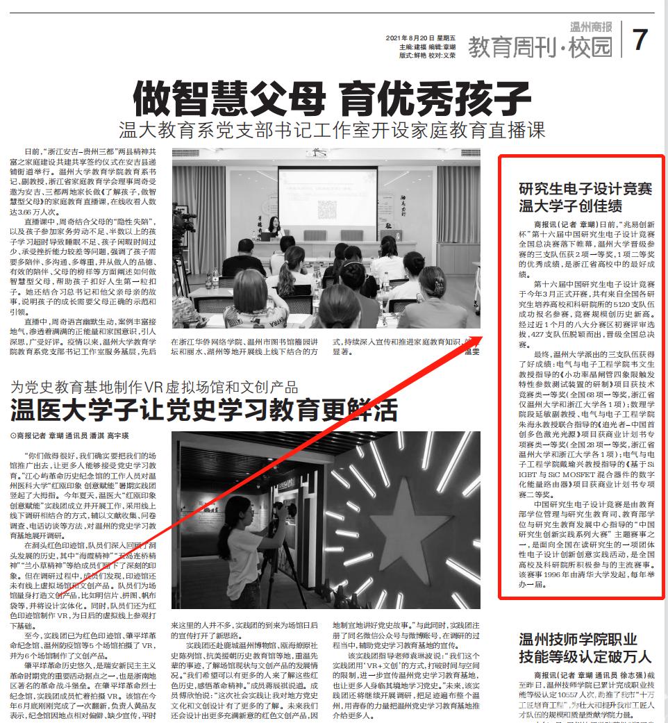 日前,“兆易创新杯”第十六届中国研究生电子设计竞赛全国总决赛落下帷幕,温州大学晋级参赛的三支队伍获2项一等奖,1项二等奖的优秀成绩,是浙江省高校最好成绩。