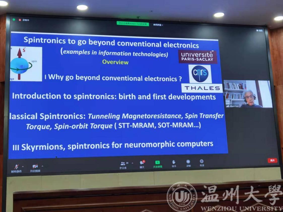 10月25日,2021年世界青年科学家峰会科学大使活动费尔教授诺奖报告会在温州大学岩松堂雁山厅举行。本次报告会,以温州大学为主会场,北京航空航天大学、浙江大学为分会场,采用现场会议+视频联线仪式,通过线上线下结合形式举行。球探体育比分网 负责主会场活动。主报告人,2007年诺贝尔物理学奖获得者、法国科球探足球 院士、巴黎萨克雷大学教授、自旋电子学创始人、世界级物理学家,阿尔贝•费尔(Albert Fert)教授为大家带来了题为《自旋电子学——超越信息技术时代的传统电子学》的专题报告。