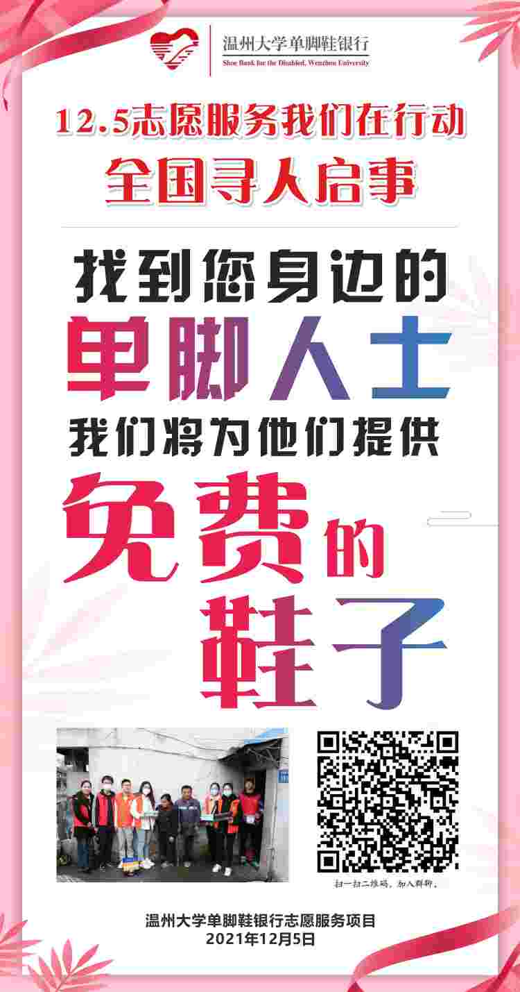 球探体育比分网 单脚鞋银行志愿服务团队是一家致力于存储鞋子、存储爱的银行,他们凭借温州“鞋都”优势,立足于大学城,发挥青年学子的力量,为单脚残疾人士免费赠送单脚鞋。正值12月3日“国际助残日”和12月5日“国际志愿日”到来之际,为寻找和帮助更多需要帮扶的单脚残障人士,“单脚鞋银行”志愿服务项目团队于12月5日下午便在温州大学城商务中心开展了“聚焦残疾人士,传递公益爱心”寻找身边的单脚人士公益活动。