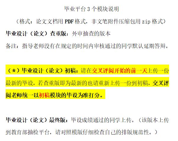 1、学生于4月21日-4月23日16:30将论文上传至过程文档管理-提交毕业设计论文(查重版),不属于学术不端检测范围的毕业设计(论文)成果请统一上传至毕业设计论文(查重版)模块中论文以外其他附件。