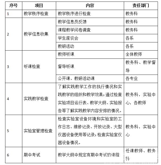 教务科组织对教学计划与教学进度执行情况及教学秩序进行检查。检查任课教师上课迟到、早退、旷课、擅自调停课及相关请假手续执行情况(包括所有课程)。检查申请停课的教师是否已经按规定进行补课等。检查学生到课及上课情况。