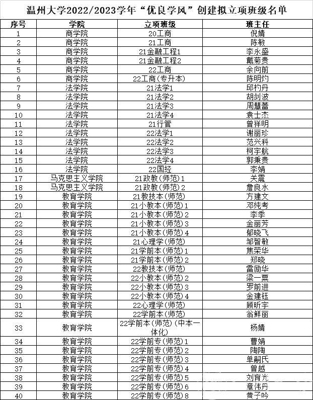 附件:温州大学2022/2023学年“优良学风班”创建拟立项班级名单