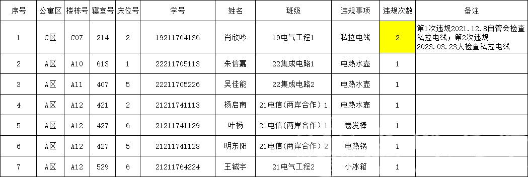 寝室使用违禁电器(卷发棒、电冰箱、电煮锅、取暖器等)、吹风机未断电、热水壶在功率内未贴标,1次是院级通报批评,累计2次校级处分。