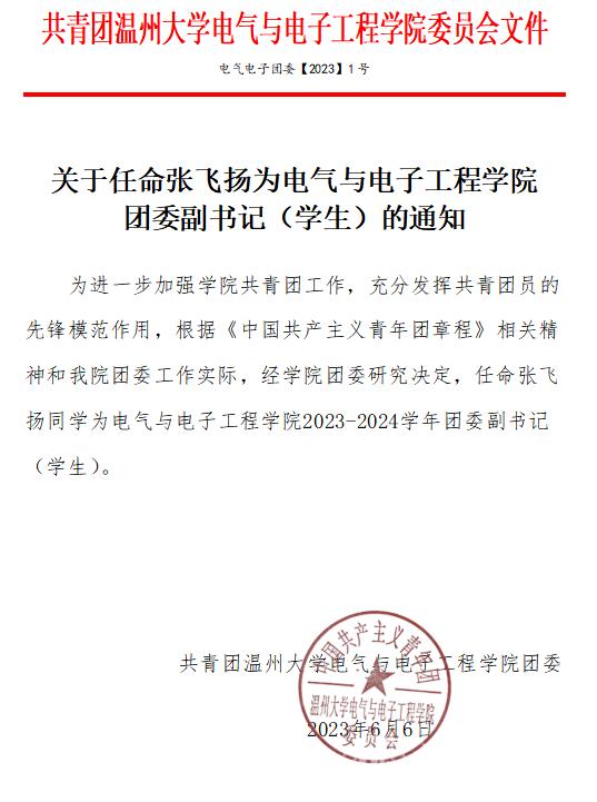 关于任命张飞扬为球探体育比分网 团委副书记(学生)的通知