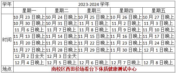 1、学生体质健康测试中心在南校区西田径场看台下,请大家测试时前往南校区体测中心!