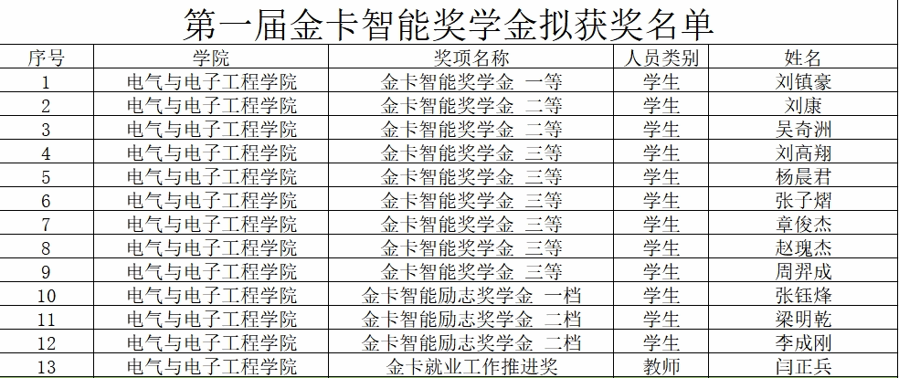 根据《“金卡智能奖学金”实施方案》文件精神,经个人申请,球探足球 初评,金卡集团复评,拟推荐以下师生获评第一届“金卡智能奖学金”:
