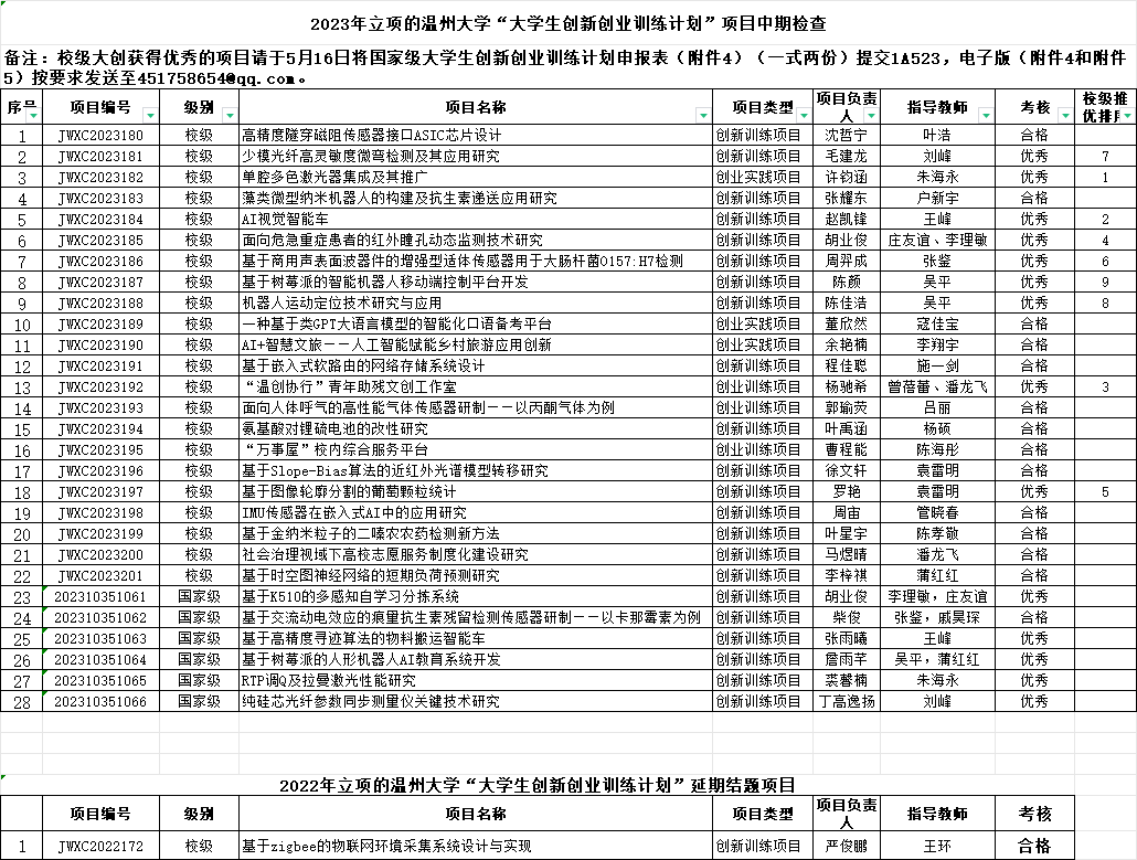 根据教务处的通知,球探体育比分网 组织了2023年立项的大学生创新创业训练计划项目中期检查及延期结题的审核,现将检查结果公示如下,公示期从即日起至5月15日,如果有问题,请联系张老师86689020。
