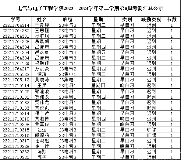 第九周早晚自习缺勤及课堂出勤情况如下: