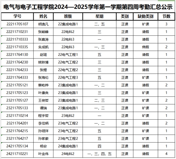 第四周早晚自习缺勤及课堂出勤情况如下: