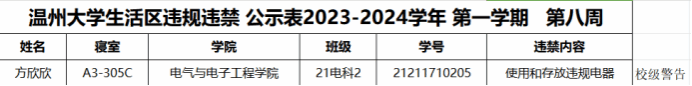 自2023-2024学年第一学期入学开始,学校针对宿舍安全进行大排查。根据学校第八周寝室安全卫生检查结果,第八周排查到1位同学存在寝室违规现象,受到学校通报;现根据学校相关规定,对上述同学进行院内通报批评,请其他同学引以为戒(名单见下):