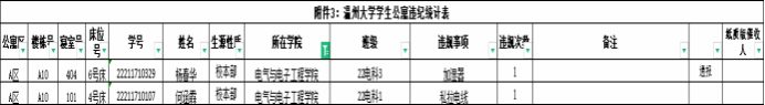 自2023-2024学年第一学期入学开始,学校针对宿舍安全进行大排查。根据学校第十五周寝室安全卫生检查结果,排查到2个同学存在寝室违规现象,受到学校通报;现根据学校相关规定,对上述同学进行院内通报批评,请其他同学引以为戒(名单见下)