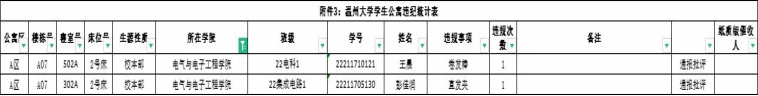自2023-2024学年第二学期入学开始,学校针对宿舍安全进行大排查。根据学校第十四周寝室安全卫生检查结果,第十四周排查到2位同学存在寝室违规现象,受到学校通报;现根据学校相关规定,对上述同学进行院内通报批评,请其他同学引以为戒(名单见下)