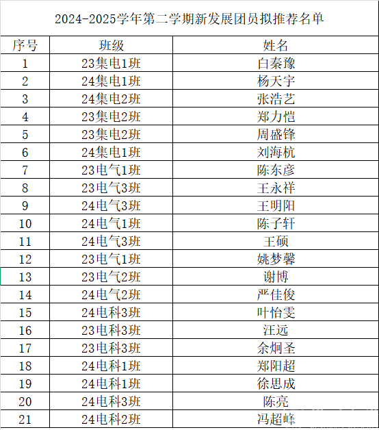根据《中国共产主义青年团章程》《关于做好2024-2025学年第二学期团员发展与管理工作的通知》等相关要求,经本人自愿申请、团支部推荐,结合在校综合表现,经球探足球 团委评议审核,拟将余炯圣等21名青年学生发展为共青团员。