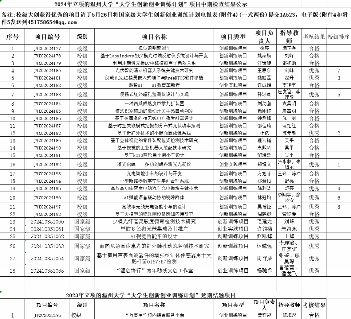 根据教务处的通知,球探体育比分网 组织了2024年立项的大学生创新创业训练计划项目中期检查及延期结题的审核,现将检查结果公示如下,公示期从即日起至5月27日,如果有问题,请联系张老师86689020。