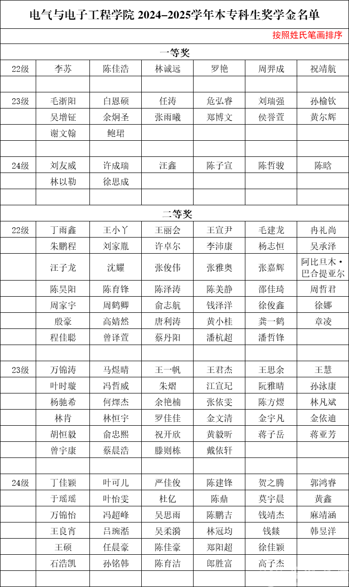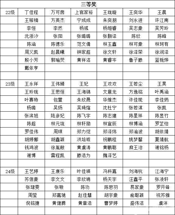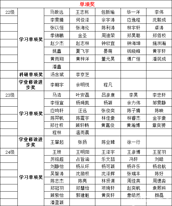 根据《温州大学奖学金实施办法》、《温州大学学生综合素质考评实施办法》、《温州大学三好学生评选办法》进行2022级、2023级、2024级学生2024-2025学年奖学金以及三好学生评选。经学生个人申报、附加分申报与审核、综合测评成绩核定、班级范围公示反馈等程序,拟评定李苏等268人为2024-2025学年校级综合奖学金获得者,拟评定马致远等108人为2024-2025学年单项奖学金获得者;拟授予丁雨鑫等130人2024-2025学年“三好学生”荣誉称号。现将名单予以公示,请班级以及个人认真核对。