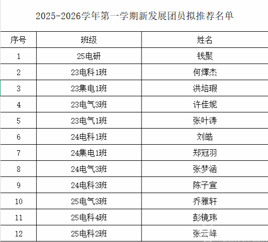 根据《中国共产主义青年团章程》《关于做好2025-2026学年第一学期团员发展与管理工作的通知》等相关要求,经本人自愿申请、团支部推荐,结合在校综合表现,经球探足球 团委评议审核,拟将钱聚等12名青年学生发展为共青团员。