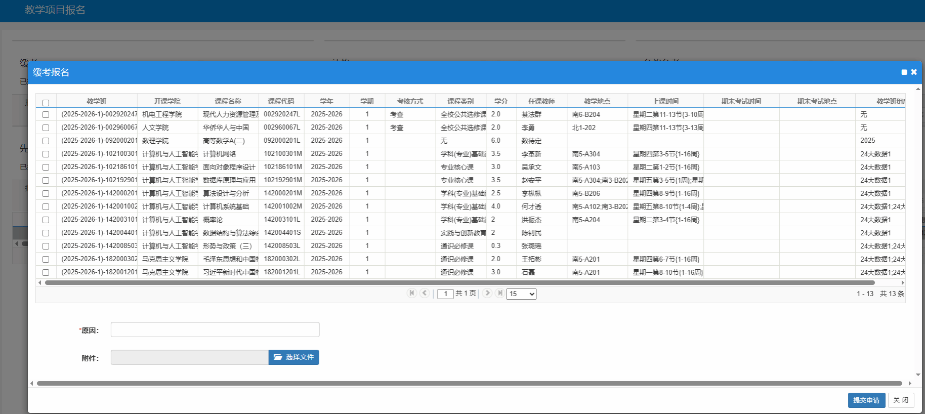 操作说明:点击页面上的“报名”按钮,在打开的子页面勾选申请缓考的的课程,填写申请原因(并上传相应附件)后,提交申请。