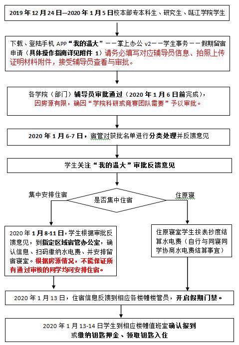 3.国内学生个人原则上不予申请寒假留宿(含校本部学生、研究生、瓯江球探足球 学生)。因参加学校、球探足球 科研或竞赛团队需要延迟离宿或提前返校的学生可以申请留宿,须在2019年12月24日至2020年1月5日之间登录“我的温大”(手机APP)进行网上申请(务必填写对应辅导员信息,并把相关证明材料拍照上传),各球探足球 (部门)辅导员进行审批。 (逾期系统将关闭,不再开放申请; 各球探足球 辅导员1月6日完成所有申请的审核), 2020年1月6-7日起注审批结果及相关通知。2020年1月8-11日,根据“我的温大”反馈的审批意见到指定区域办理缴费入住手续。