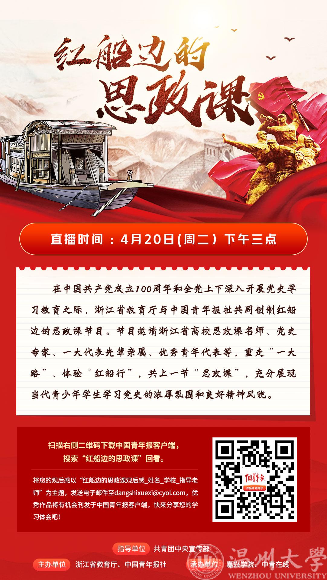 直播时间:2021年4月20日(周二)15:00至16:00,直播地址:中国青年报App客户端(进入客户端搜索“红船边的思政课”,客户端、PC端直播链接//news.cyol.com/gb/live/articles/2021-04/15/content_KEVGmHBbA.html);“教育之江”微信公众号、浙江高校网络思想政治工作中心、“之江汇”教育广场等平台将提供相关观看渠道。