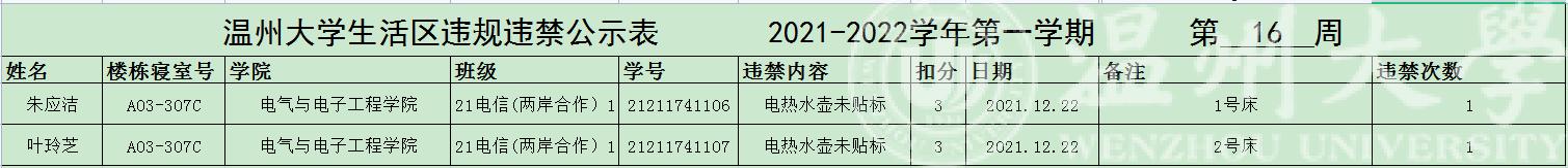 自2021年下学期入学开始,学校针对宿舍安全每周进行大排查,根据学校第十六周寝室安全卫生检查结果,排查到球探体育比分网 朱应洁、叶玲芝两位同学存在寝室违规现象,受到学校通报。现根据学校相关规定,对以上同学进行院内通报批评,请其他同学引以为戒。