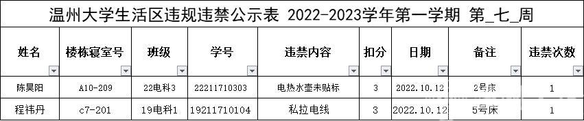 自2022-2023学年第一学期入学开始,学校针对宿舍安全每周进行大排查,根据学校第七周寝室安全卫生检查结果,排查到2位同学存在寝室违规现象,受到学校通报。现根据学校相关规定,对上述同学进行院内通报批评,请其他同学引以为戒(名单见下)