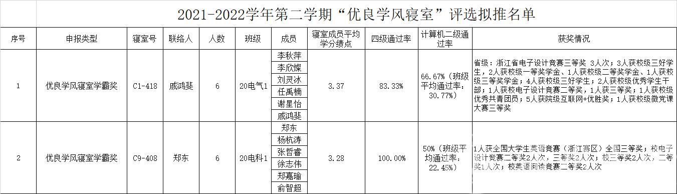 为进一步加强院风学风建设,发挥优秀寝室树立的导向和典型作用,引导和激励广大学生刻苦学习、立志成才,根据《球探体育比分网 优良学风寝室评选办法》规定,经各寝室申请,球探足球 初评,拟推荐 C1-418等2个寝室获得2021-2022学年第二学期“优良学风寝室”称号。现将名单给予公示