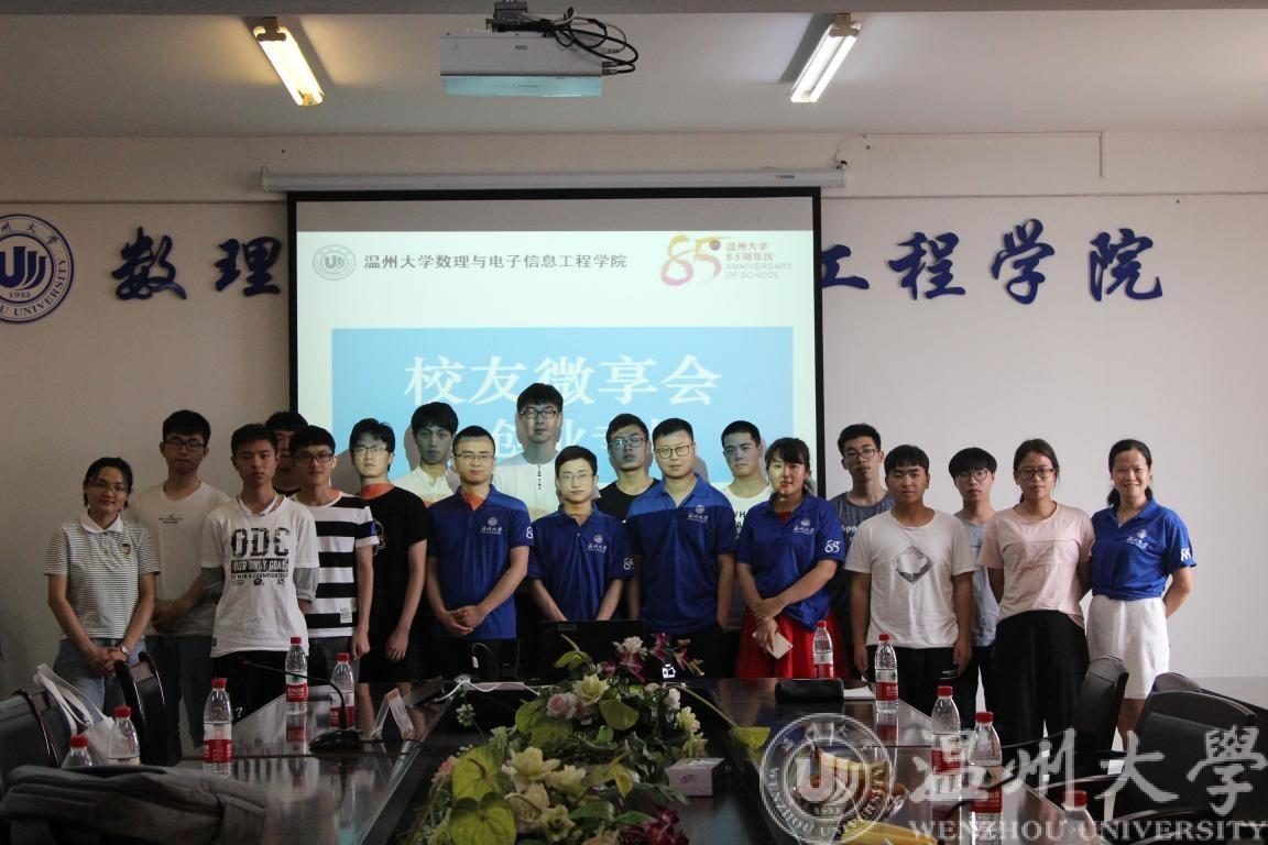 2018年5月19日,在温州大学85周年校庆之际,温州大学数理与电子信息工程球探足球 校友日如约而至。下午13:00,校友微享会——创业专场在1A502召开。出席本次会议的有学生科副科长林丽丽老师,优秀校友张立、宋海林、刑翔、韩鹏及部分学生代表。