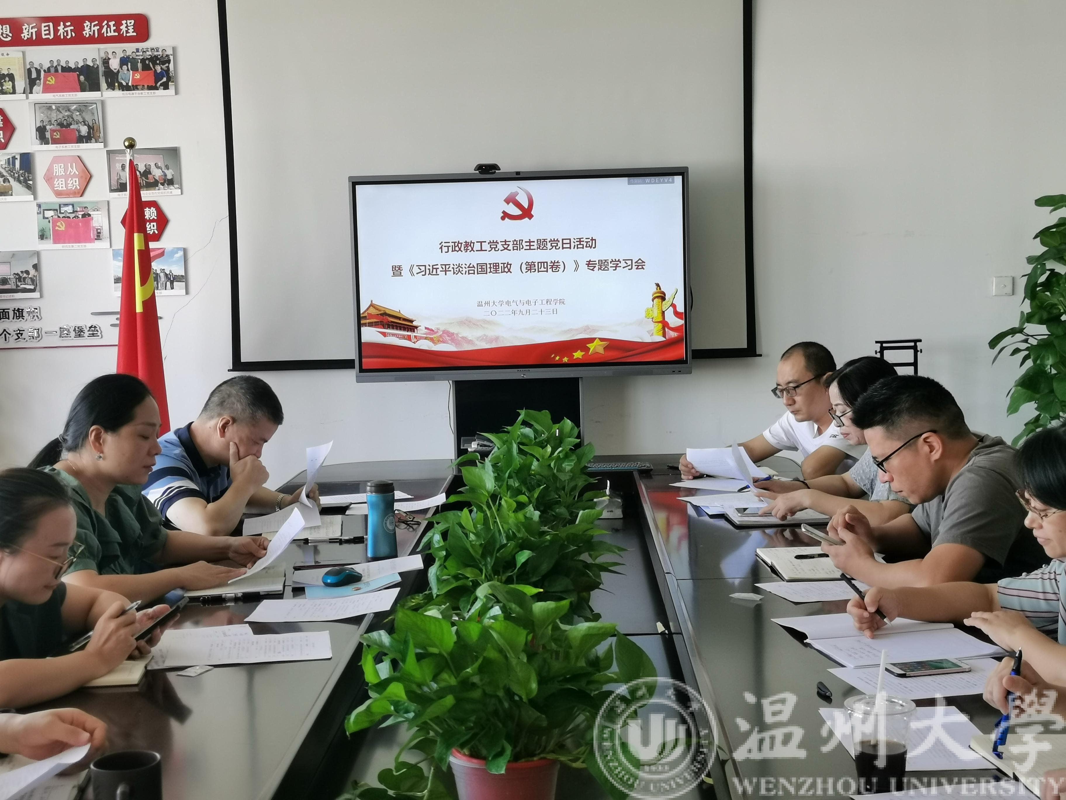 9月23日上午,球探体育比分网 行政教工党支部在院党务活动室召开主题党日活动暨《习近平谈治国理政》第四卷专题学习会,行政教工党支部全体党员参加了此次会议。会议由行政教工党支部书记曾蓓蕾主持。