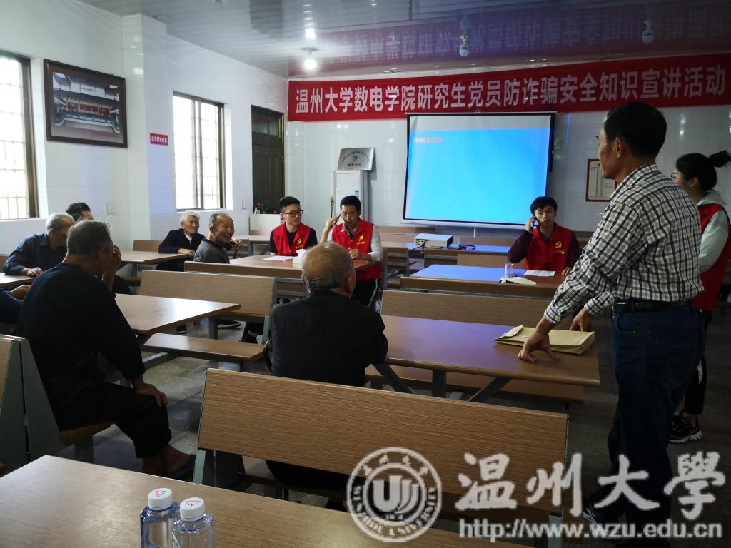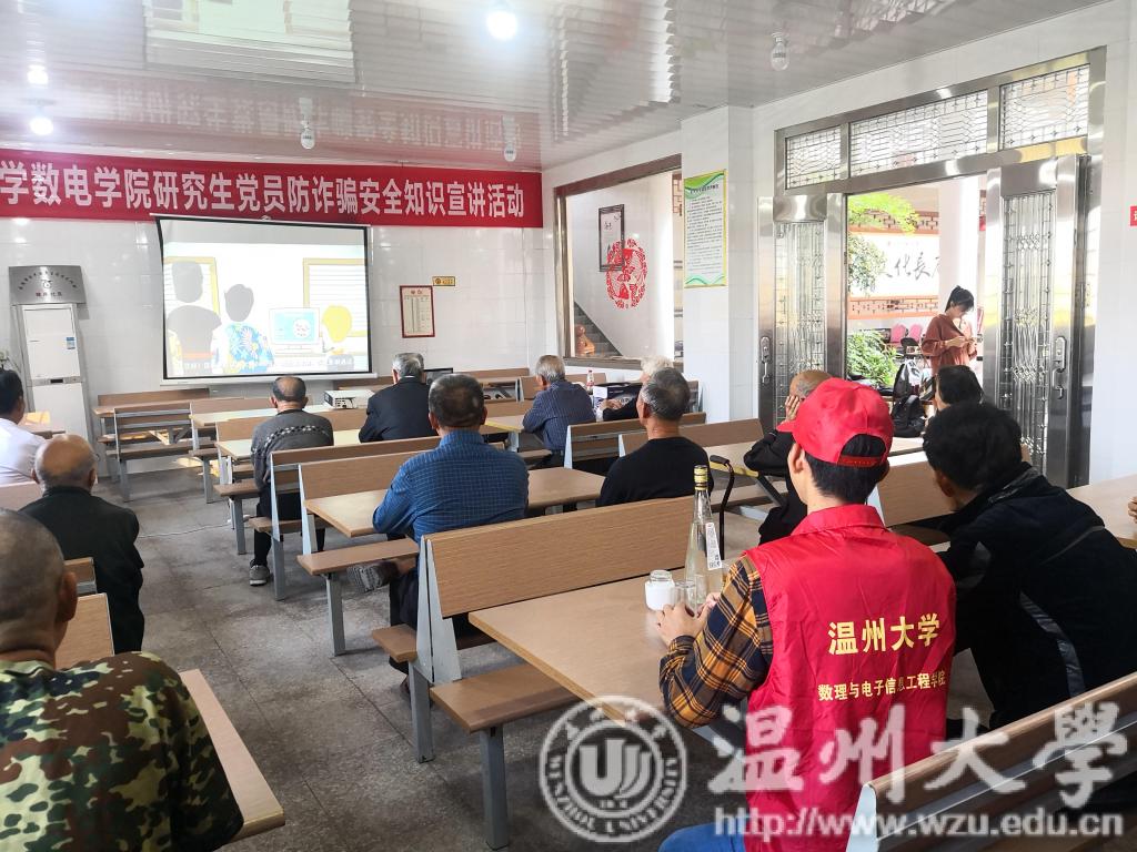 11月7日,温州大学数理与电子信息工程球探足球 研究生党员借新青年下乡的契机,走进乐清翁垟街道开展党日活动,聆听了翁垟街道离退休干部支部书记题为“学习党的历史,传承红色基因”的党课,并为离退休支部老党员和当地群众做了防诈骗安全知识宣传。