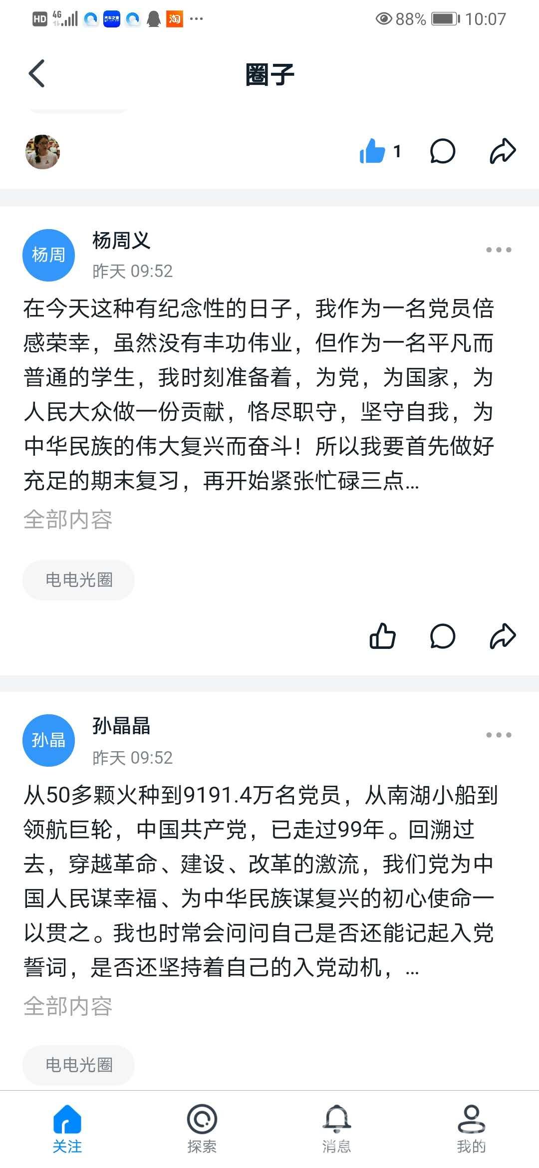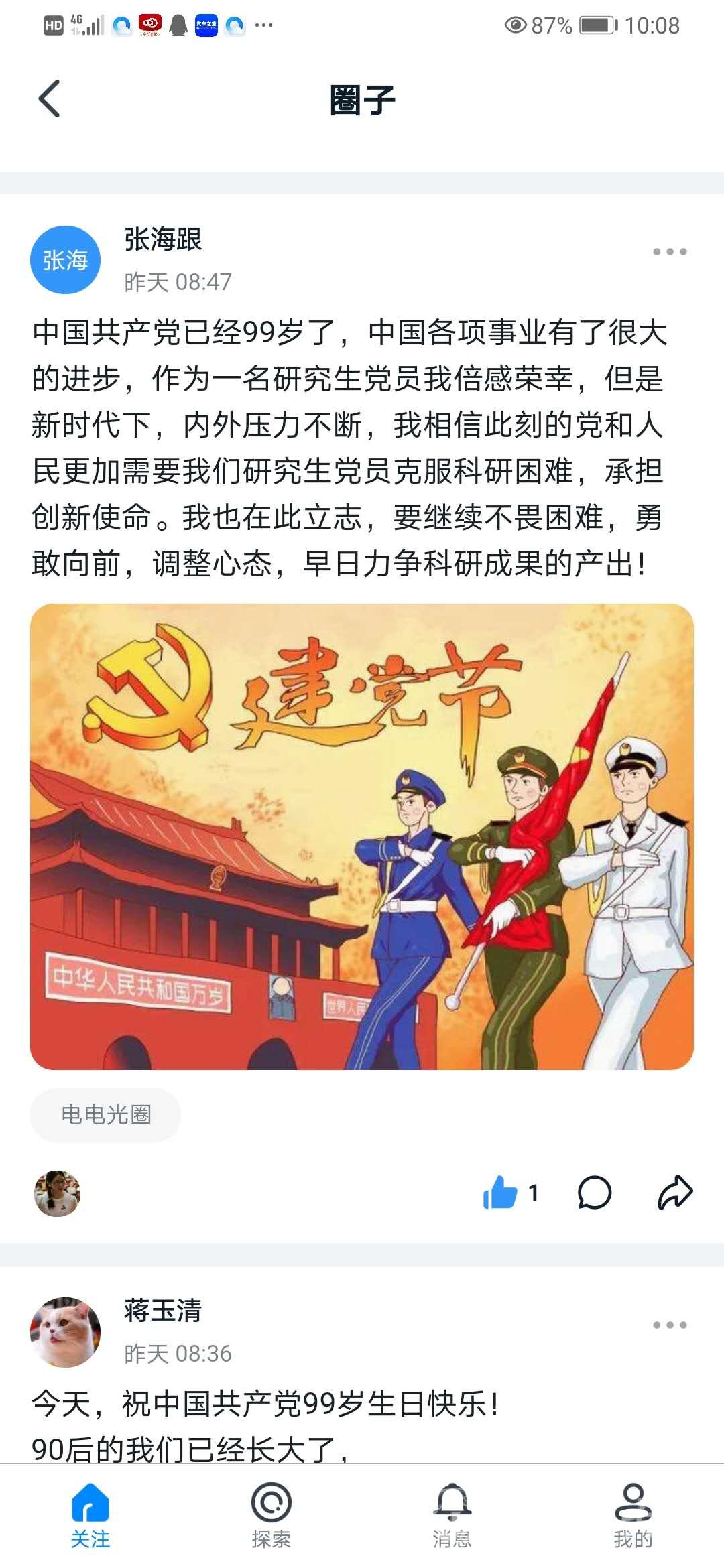 本科生第二党支部新党员梅豪杰在圈子中写到:“早上七点钟起床做的第一件事就是发了个QQ说说,想表明自己成为预备党员的开心和对党一路走来艰辛的佩服。作为大学生党员,我一定得努力学习专业知识,争取成绩在班里走在前头。暑假疫情还没有结束,还想继续为抗疫做贡献......”本科生第一支部宣传委员沈铭洋说:“诗词并不是说说,我会以实际行动来证明自己,当前国际形势复杂,更需要我们这一辈人的努力奋斗,作为学生党员,我讲努力学习,考取研究生,为国家将来的电子行业发展贡献自己的力量,正如誓词所说,积极工作,为共产主义奋斗终身。”研究生第二支部书记张海根也表示:“新时代下,内外压力不断,党和人民更加需要我们研究生党员克服科研困难,承担创新使命,我在此立志,不畏困难,力争早日有科研成果产出!”