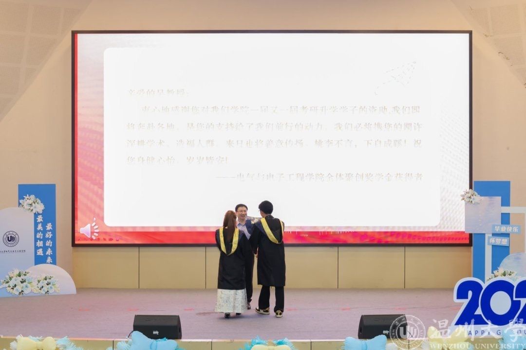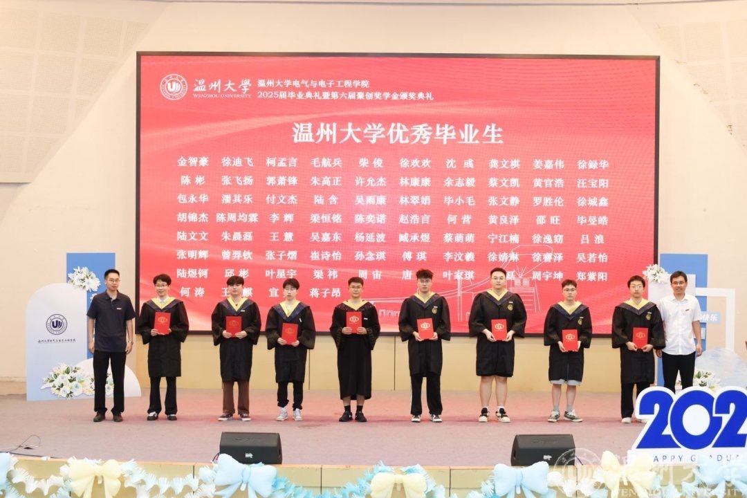 省、校优毕业生表彰环节气氛热烈。校优毕业生代表金智豪、徐迪飞等63名同学,以及省优毕业生胡业俊、应利波等14名同学依次登台,从院领导手中领过荣誉证书。掌声中,一张张年轻的面庞写满对过往的珍视与未来的期许。